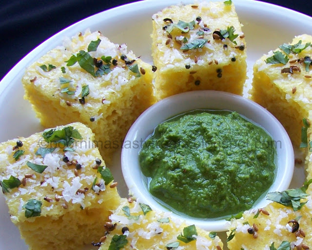 This months dish for Indian Cooking Challenge was Khaman Dhokla. Dhokla is a Gujarati dish and one of the healthiest snacks, almost guilt free. It's also so visually appealing with its bright yellow colour and all the garnish, just impossible to resist. I made this last week when I had a couple of friends over and we enjoyed every bite.