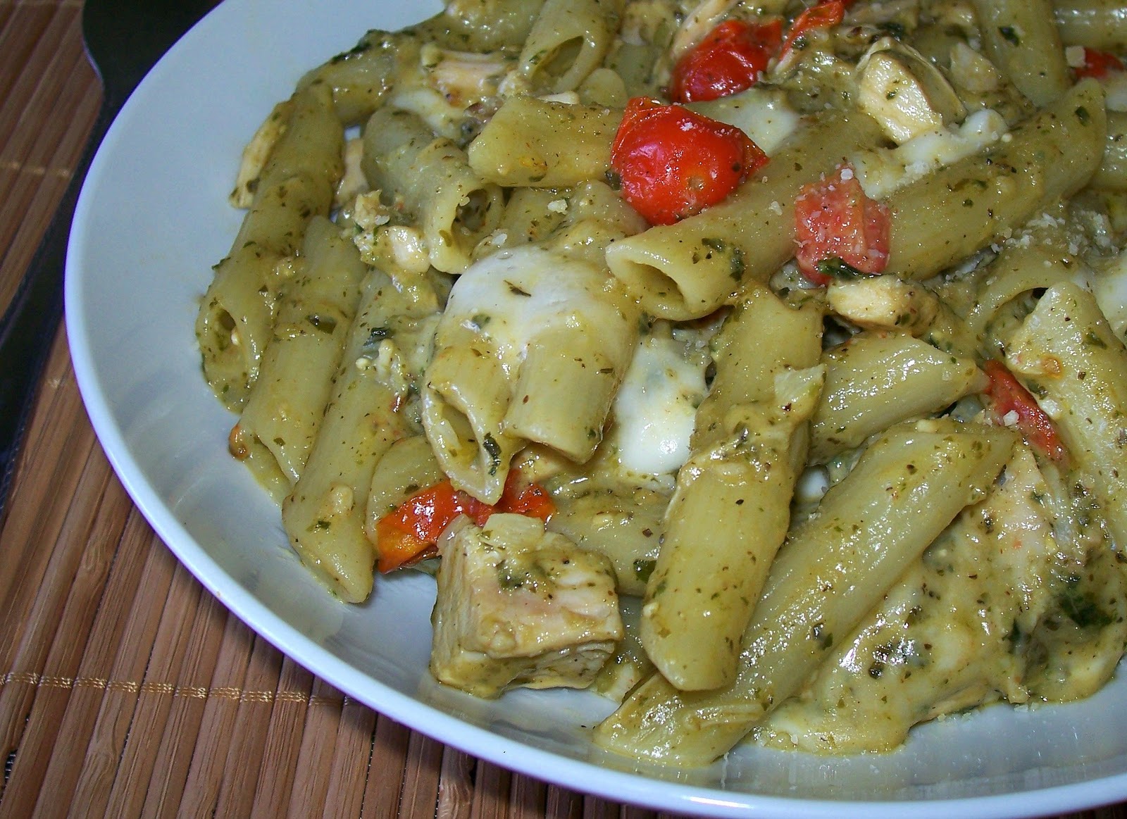 Drain the pasta and immediately add to the sauce. Stir in the pesto, chicken, tomatoes and mozzarella. Mix everything till combined and take off the heat.