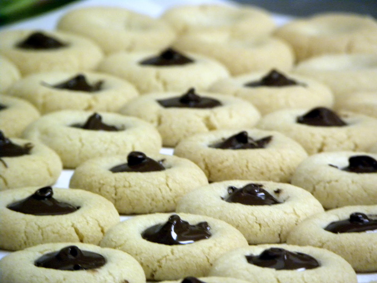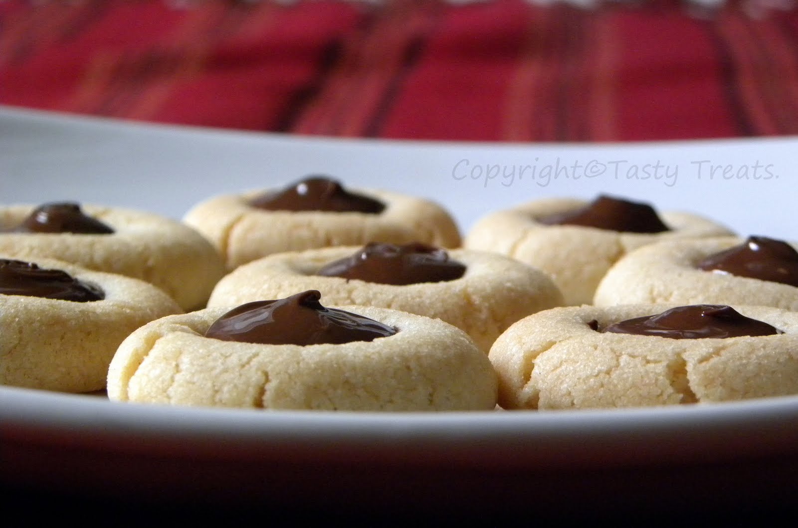 We had a lot of get togethers with family and friends and so lot of opportunities to bake. I had these cookies bookmarked for a while from Martha Stewart and Patricia. They look too cute to eat, don't they? They were delicious, even without the chocolate and I actually left some plain without the filling. I used the back of a round measuring spoon to make the impressions and not my thumb (the cookies were really hot!!).